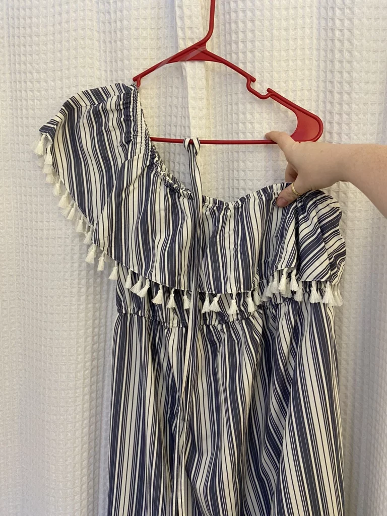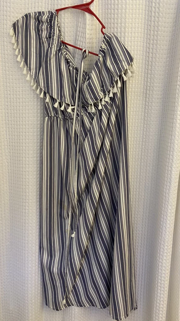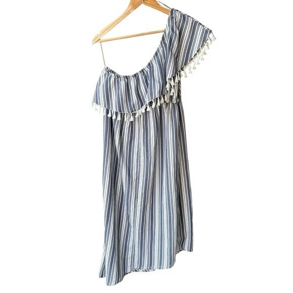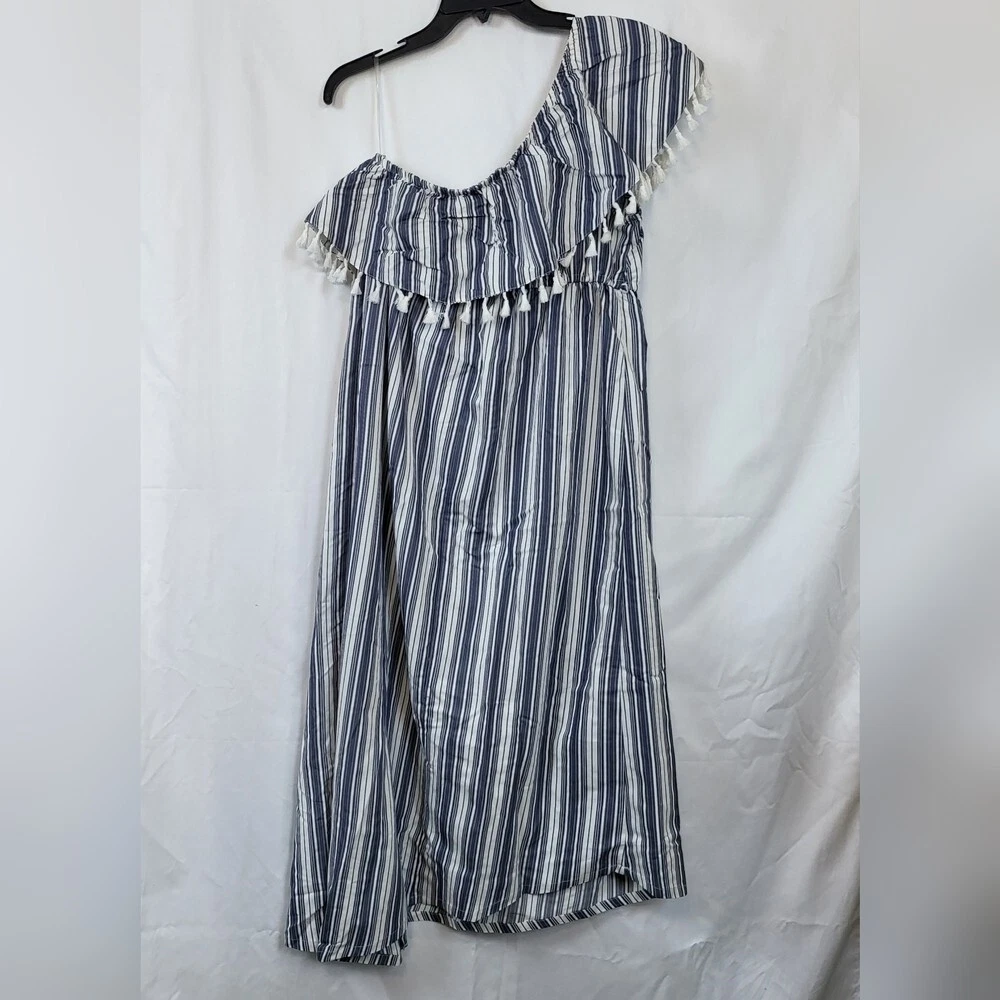 Lightweight maternity maxi with an asymmetric one-shoulder neckline and tasseled detail. Features an elastic empire waist for a flattering fit, vertical blue/white stripes, and a comfortable pullover design. Rayon-blend fabric drapes softly—ideal for spring/summer and easy styling for casual, travel, or party/cocktail looks.